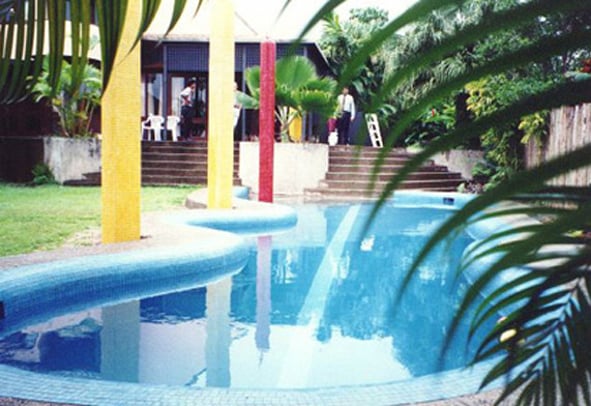 A fully tiled serpentine and colourful swimming pool in a lush tropical garden of a Ron Seeto designed family residence for a local lawyer in the hills outside Suva.